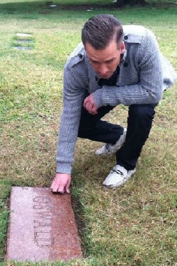 After the museum visit the meta aspect of the tour truly kicked in. We set off by bus on the Oswald portion of the event, stopping first at his modest gravestone in the Rosehill Cemetery in the southeast corner of Fort Worth. Being there on Oswald’s birthday was one thing. Being there with Will Rothhaar (above right), the actor who portrays Oswald in “Killing Kennedy” and will likely be very well known once the film is telecast, was quite another. Hauntingly, someone had left a bouquet of flowers that morning on Oswald’s grave.