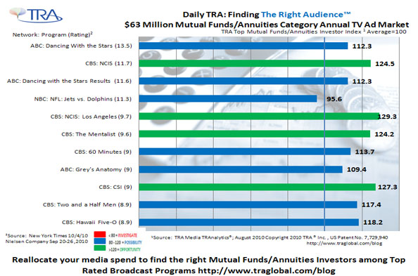 Investing in “The Right Audience™” makes financial sense for advertisers of Mutual Funds and Annuities among Top Broadcast programs. Four of the top ten rated programs also deliver a high index for Mutual Funds and Annuity Investors. What does this mean for advertisers of these products? Airing your message on these programs will allow you a far greater return on investment and improved ROI than if you used just standard demographic information. TRA’s patented Media TRAnalytics® provides advertisers and networks with the information needed to plan and buy their advertising such that both parties maximize ROI.