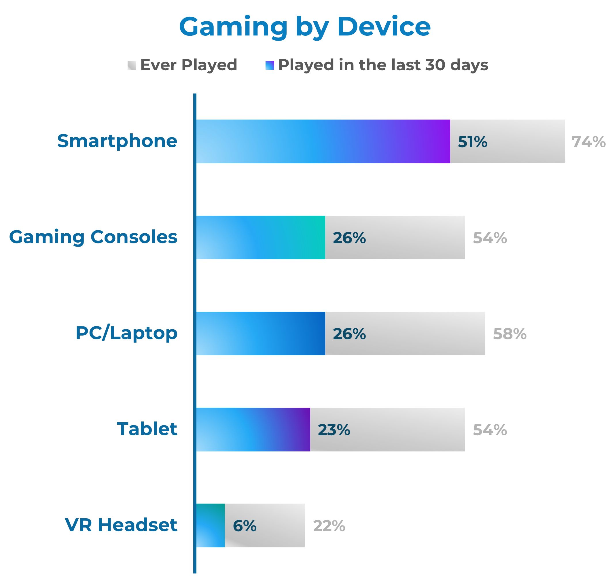 - 2 out of 3 respondents report playing a game on at least one of their devices in the last 30 days.