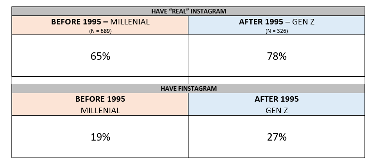 Gen Z generally has more followers of their real Instagram accounts when compared to Millennials. Results show that the sphere of social influence among digital native Gen Zers stands to be more powerful than that of Millennials who have fewer followers and are less likely to have a secondary outlet for communicating (Finstagram).
