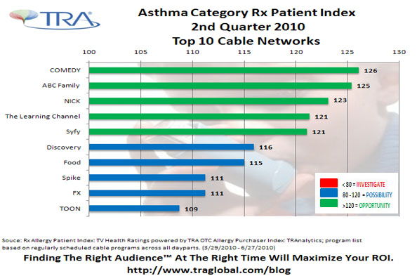 As allergy season quickly approaches and World Asthma Day is just a few months away, advertisers in prescription Asthma medications who are looking to maximize the efficiency of their ad spend and brand exposure can benefit from TV Health Ratings powered by TRA. Using a unique metric, which provides a category development index (patient index); TRA can identify which networks are more likely than the average for pharmaceutical advertising to seek out Asthmatics and their behavior for prescription drug commercial airings. The following chart indicates the Top 10 rated cable networks in 2Q10 that are more likely than the average to connect with these Asthmatics currently seeking treatment.