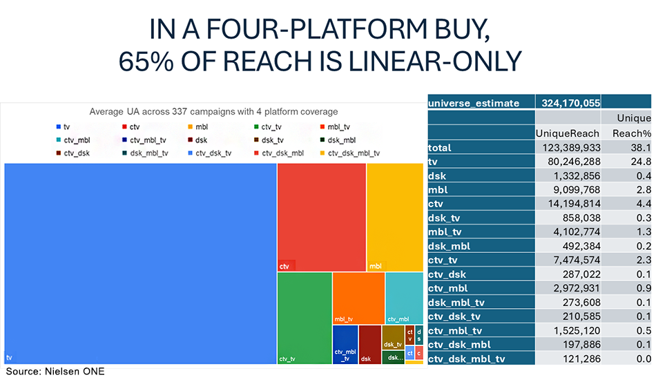 In other words, 65% of the people 2+ who were reached by the average of these 337 randomly chosen 2024-2025 four-media campaigns, were reached ONLY by linear TV.
