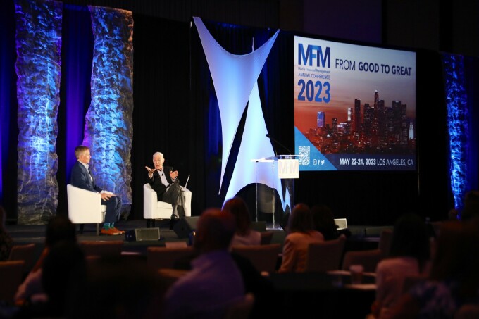 In Part 1 of this two-part series, we learned why MFM sought out business expert/author Jim Collins to keynote the Opening General Session during its 63rd Annual Conference, held in Los Angeles from May 21-24. Not only did Collins share his discoveries around the key differentiators between good and truly great companies, he had conference participants break into small groups and come up with the most challenging questions they derived from his first 75 minutes on stage. There were so many that the lights came up to signal the end of the session before he could call on each group. Collins (pictured above, right) wisely invited Dave Bestler (left), CFO of Hubbard Radio and MFM Chairman, to join him on the stage to get additional insight and context from someone who has spent the vast majority of his career in media finance.