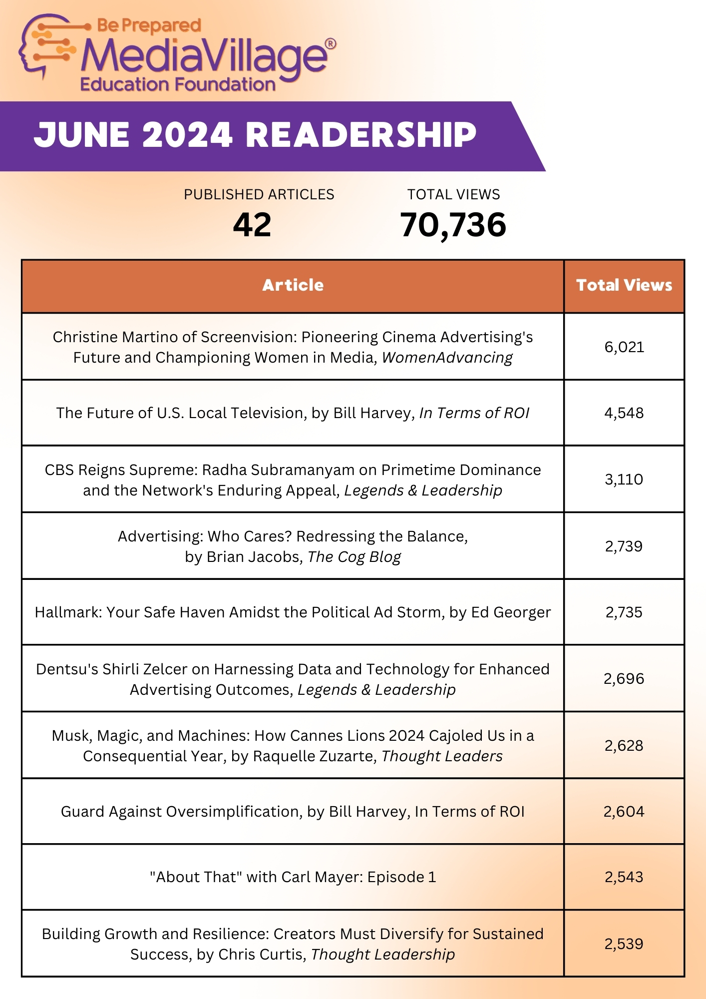 Perspectives and insights from female leadership topped our readership this month, with standout interviews with Screenvision’s Christine Martino, CBS’ Radha Subramanyam, and dentsu’s Shirli Zelcer. Martino’s interview on WomenAdvancing with E.B. Moss took the month’s top spot as they delved into Screenvision Media’s efforts at reaching the powerful 35-and-under moviegoing demographic. Subramanyam shares her insights at how CBS continues to reign supreme in 2024 as the most-watched primetime network despite obstacles from the 2023 WGA and SAG-AFTRA strike. Lastly, dentsu’s Chief Data and Technology Officer Shirli Zelcer breaks down the evolution of technology in the industry and how AI should be embraced as a tool for innovation and growth.