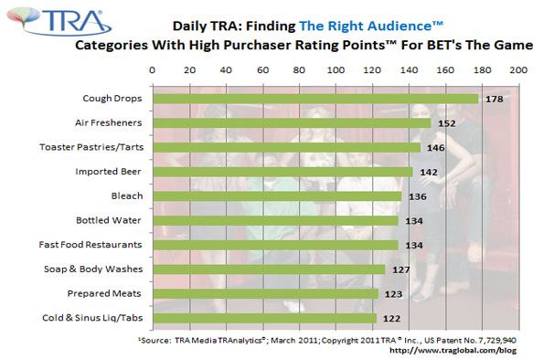 Networks are now adding a new weapon to help them build market share – TRA’s Media TRAnalytics®, the only platform that allows networks to learn which advertisers represent potential ad sales revenue. By finding out who is watching their programs and what products they’re buying, networks are able to make decisions about which advertisers would benefit from advertising on their programs. With this information, advertisers are finding The Right Audience™ for their product, eliminating waste and maximizing ROI while networks are able to retain, upsell and gain new clients as well as increase their share of the media buy. In the example below, BET’s The Game, one of the top rated cable programs for the week of Jan 31st, indexed with very high Purchaser Rating Points™ (PRP™) for several categories including Cough Drops, Bleach, Fast Food Restaurants, and Air Fresheners. This vital information enables networks and advertisers to both benefit – the ultimate win-win situation!