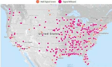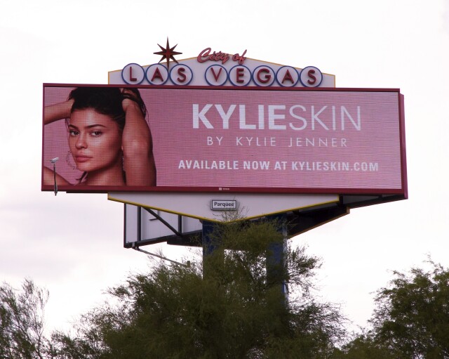Kylie did so by targeting 1,100-plus cities; over 4,000 roadside digital billboards; Times Square and Las Vegas Boulevard spectaculars (pictured below and at top, respectively), and more than 1,500 video screens in hundreds of malls. (See map at bottom for all locations.)