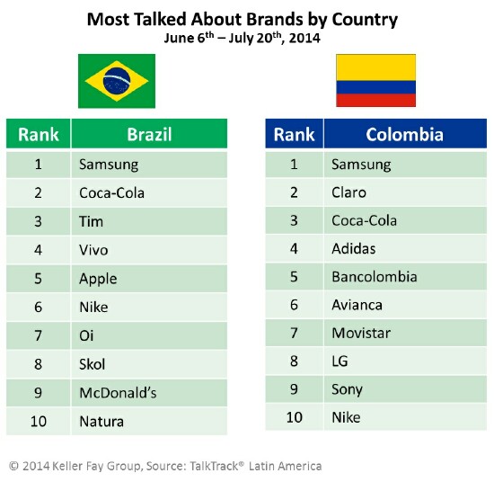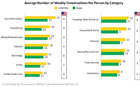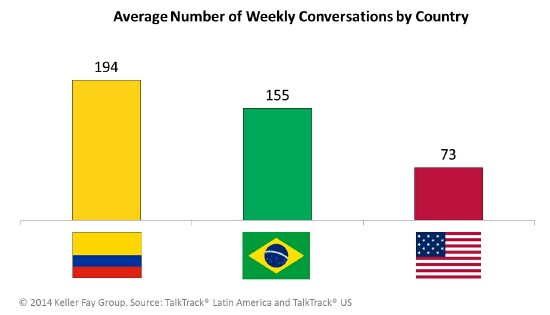 Word of mouth research conducted recently in Brazil and Colombia reveals consumers in these countries talk about brands at more than twice the level of the American public. In total, Brazilians engage in 155 conversations about brands per week, and Colombians top that level at 194 discussions per week.