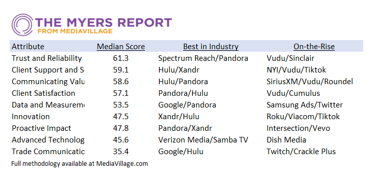 One of the interesting aspects of this year's study, aside from the relative dearth of legacy media companies making top grades, are the declining median scores. On a scale of 1 to 100, the general median score has been 65, "and we rarely saw media scores below 50," Myers stated. But this year saw no category at the historical 65-as-passing median and some categories such as Innovation, Proactive Impact, Advanced Technology and Trade Communication, woefully low. More needs to be done industry-wide to bolster the efforts in these areas for advertisers and brands.