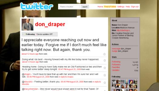 Earlier this week I was happy to report that Mad Men’s characters had joined Twitter, with the help of some fans with a lot of time on their hands. This morning I was disappointed to see "Paul Kinsey," a copywriter on the show whose account hadn't yet been deactivated, had Twittered: “Our days on Twitter are numbered, my friends http://tinyurl.com/5bm8t.”