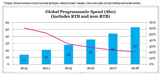 · The US is leading the global adoption of programmatic: with $10.9bn worth of transactions in 2014, the US represents 53% of the global programmatic market. Programmatic transactions will represent 62% of display-related digital dollars this year in the US, growing to 82% by 2018.