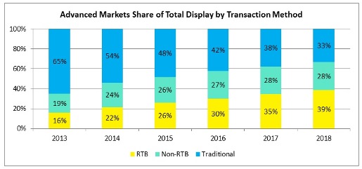 The US is leading the global adoption of programmatic: with $10.9bn worth of transactions in 2014, the US represents 53% of the global programmatic market (58% of the global RTB market). Programmatic transactions (RTB and Non-RTB) will represent 62% of display-related digital dollars this year, growing to 82% by 2018. By 2018, only the most premium digital inventory (sponsorship, full episode video, non-standard formats) will still be transacted through traditional mechanisms. In the last 18 months, adoption has been boosted by increased usage by large verticals (such as CPG, automotive and pharmaceuticals) and direct-response verticals (such as real estate, dating, gaming, and education). That large vertical usage was made possible by the availability of new tools allowing marketers to measure and benchmark the impact and efficiency of programmatic campaigns on branding goals (and not just immediate conversion).
