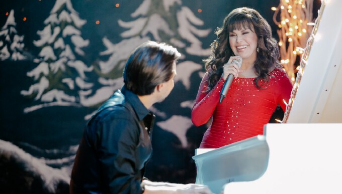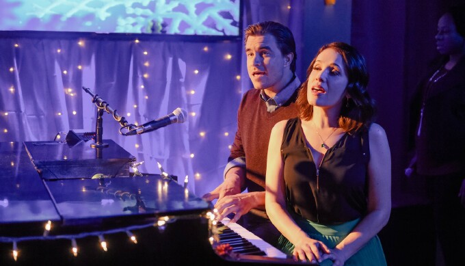 That musical component came in three ways -- courtesy of her character, Lindsay; her co-star Rob Mayes (pictured at top and below with Sokoloff), who plays Wes, and entertainment legend Marie Osmond, who plays country music legend Cassie. In the film, Lindsay and her musical rival Wes (Mayes) form a dynamic dueling piano team. Lindsay is in the process of organizing a trip to visit her expectant sister when the duo suddenly finds themselves without a gig on Christmas Eve and has no way to pay for the tickets home. With Wes also planning to head home to visit his ailing mother (in a nearby town), the two become unlikely traveling companions on a road trip. It's through a series of misgivings that they encounter Cassie, whom Lindsay idolizes, and who helps save the day.