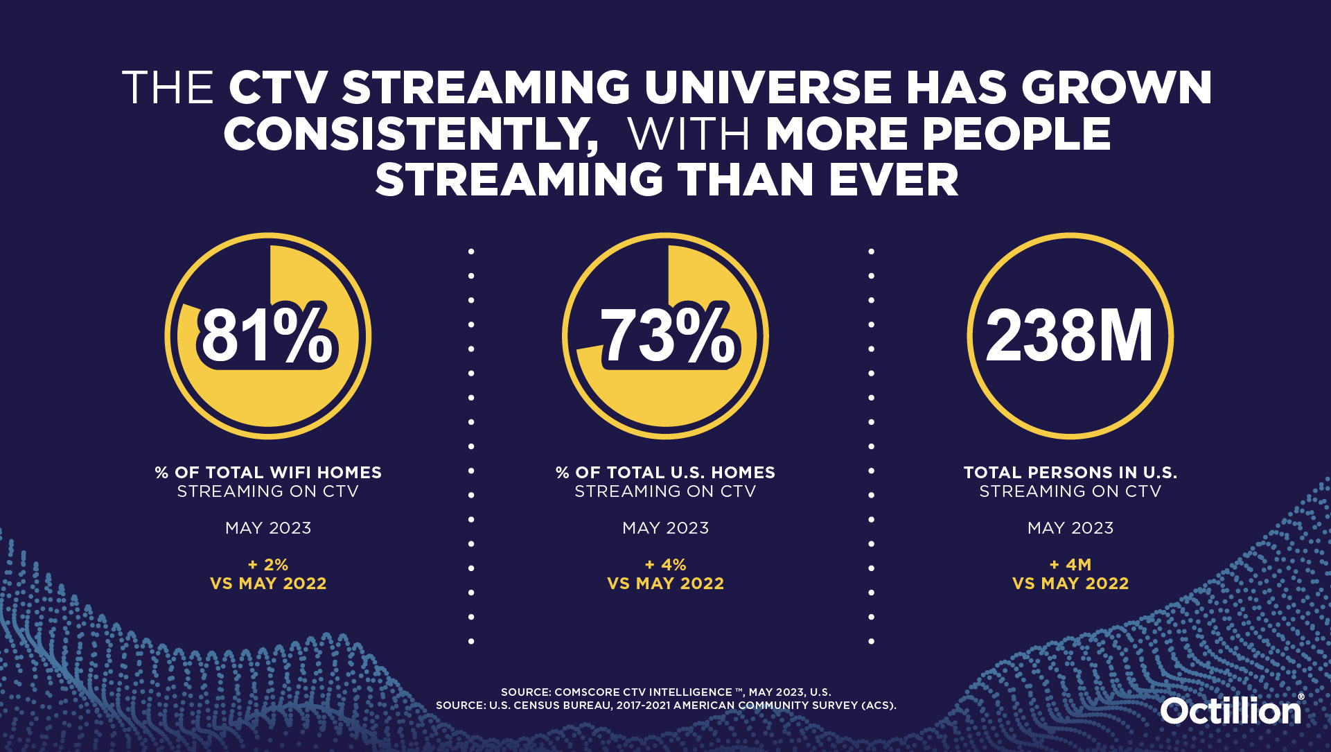 - CTV/OTT: With 73% of U.S. households currently streaming (according to the 2023 Comscore State of Streaming Report) and over 85% predicted to be reachable via CTV/OTT by 2025, this is a territory you can’t ignore. Inject at least 30% of your ad spend here for a mix of above the line and below the line effectiveness. Your, above the line is a straight brand play, think TV, but targeted to key zips, states, DMA’s, congressional districts (without an audience target) and below the line is more performance or business outcome driven targeting specific demographic or interest segments.