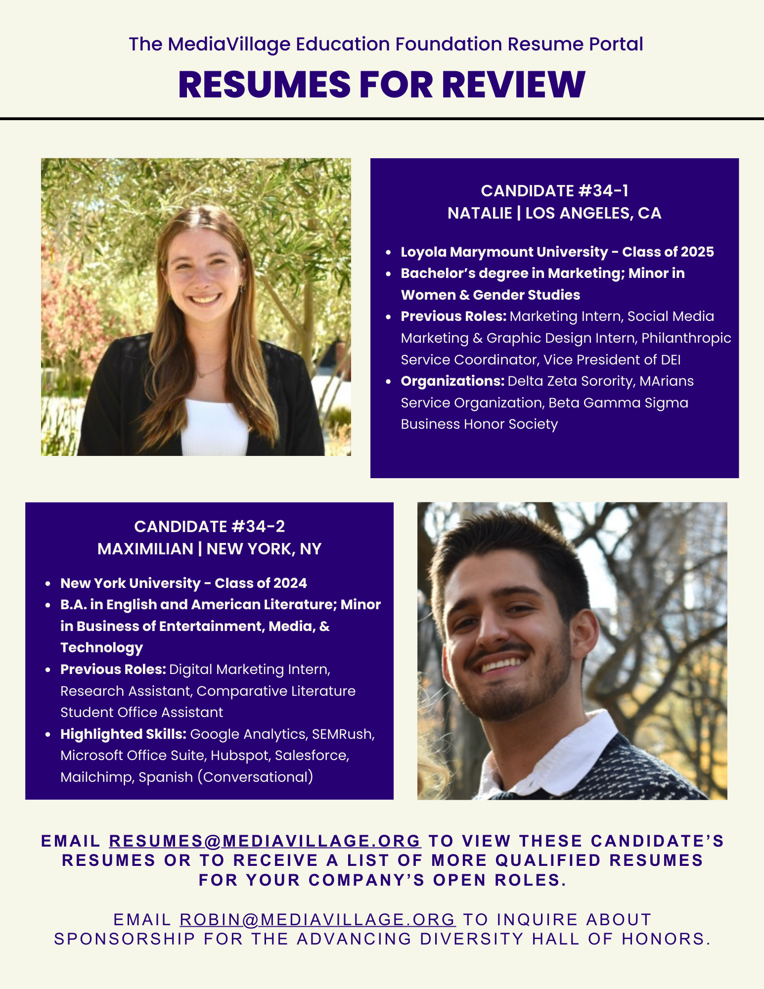 The MediaVillage Education Foundation coordinates with college career centers and organizations to attract diverse talent to our community. Each week in this space we are highlighting profiles of candidates who have submitted resumes at our AdvancingDiversity.org Resume Portal, where anyone looking to join the media and advertising business is encouraged to submit their CV and be connected to hiring teams. Watch for this weekly Resumes for Review e-mail.
