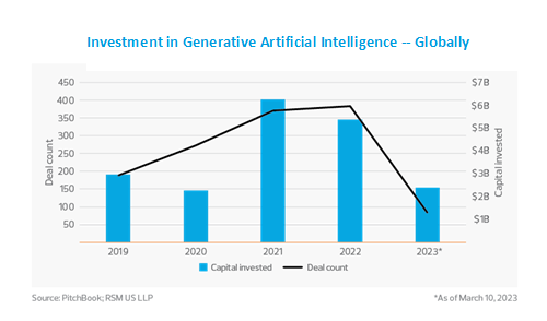 Investors are increasingly recognizing the opportunities presented by generative AI. In just the first 70 days of 2023, global investment by private equity and venture capital in generative AI reached $2.38 billion and is on pace to exceed 2022's total investment of $5.3 billion. Of those invested companies, 16 reached unicorn status, although some had exceeded the $1 billion valuation prior to their most recent financing.