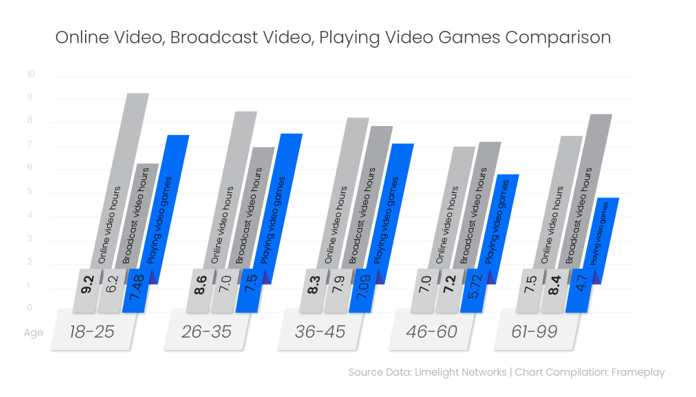 Even more fascinating is when we compare the State of Online Gaming with Limelight Network State of Online Video 2020. In age brackets 18-25 and 26-35 the average weekly time spent playing games is higher than the average weekly time spent watching broadcast video, and not as far off from the average online video hours watched weekly as one might expect.