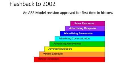 I met Erwin during my second year in the business and we were good friends for life after that. Before he left, we had done many things together, one of which was to update the ARF Model. The ARF Model is a construct for analyzing the steps involved in advertising causing incremental sales through brand perception changes. The original version had six levels and we added two more, Attentiveness and Advertising Response. This is what it looks like (not the official depiction, which is a spiral fan) since our 2002 update: