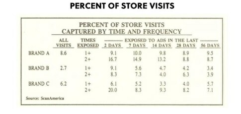 At the 1-exposure level, Brand B showed the greatest increase in brand purchase capture rate as percent of store visits, increasing from 5.6% to 9.1% if hit by an OTS in the last 48 hours before store visit. At the double-tap two exposure level, the other two brands benefitted more. Not all creative works exactly alike psychologically in doing its persuasion work, nor is every piece of creative equally benefitted by enhancers/degraders such as frequency, recency, context, etc.