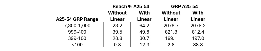 The first thing that jumped out at me was the difference that linear makes. When linear is part of the campaign, the reach is generally much higher than when linear is excluded, as we can see from this table: