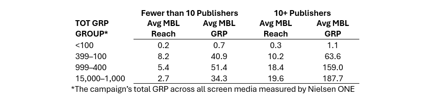 A very similar picture at far lower mobile GRP levels. With fewer than 10 mobile publishers, on average, you can’t get into double-digit reaches. With 10 or more mobile publishers, you can get close to a 20% mobile reach on average. And probably higher if you pour on the mobile GRPs. In an earlier article, we saw that with maximum GRPs (800) mobile can, on average, go as high as 31% based on Nielsen ONE meta-analysis, and with maximum dispersion as high as 70%. (That meta-analysis was based on Adults 25-54.)