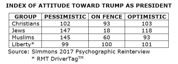 By the way, we find no empirical basis for the claim that Trump supporters are more oriented to the Bible than non-Trump supporters. For example, this Simmons psychographic study of 5000 respondents randomly reinterviewed from the 25,000 Simmons 2017 study shows that two of the three groups that most support the Bible were in 2017 if anything skewed away from supporting Trump, with Christians split equally for vs. against. The same source shows that Liberty is almost equally motivating to Trump supporters and to Trump non-supporters.
