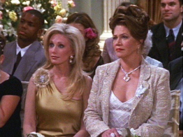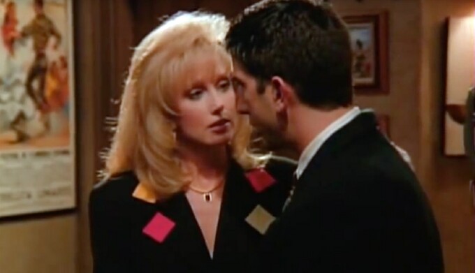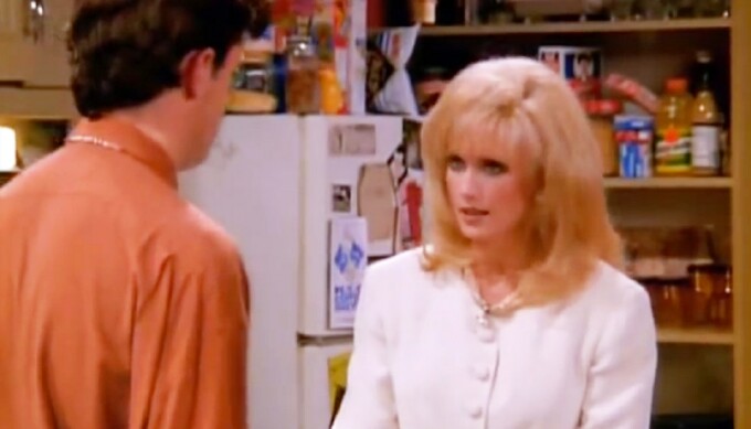 Throughout its 10-year run, some of the most memorable moments on Friends belonged to those guest-stars playing parents. They are more than just Friends of Friends; they are also Family of Friends. Hindsight credit must be given to the comedic talents of greats like Christina Pickles (Judy Gellar) and Elliott Gould (Jack Gellar), who portrayed Monica and Ross’ parents; Teri Garr (Phoebe Abbott), whose character was found to be the birth mother of twins Phoebe and Ursula; Brenda Vaccaro as Joey’s mom Gloria; Marlo Thomas as Rachel’s “perfect” mom Sandra and, of course, Kathleen Turner as Chandler’s dad, Vegas performer Helena Handbasket (a.k.a Charles Bing). When it came to parents leaving a mark on the gang, though, no one can top Chandler’s mother Nora, the author of many steamy romance novels, played by Morgan Fairchild (pictured above with Turner), who famously left her mark on Ross. “I was the first person to kiss a Friend,” boasted Fairchild when I asked her about the role. “The show was still new, and I was [one of] the first parents cast on Friends, and the first person to kiss one (Ross), so that was a lot of fun.’’
