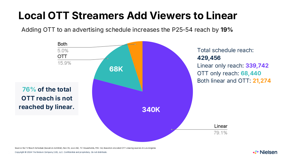 Nielsen is also selling measurement of advanced client first-party (1P) audiences locally, and doing outcome measurement locally, including matched market trials. The most innovative of stations are already taking advantage of these new services, and it seems likely that all stations will soon be using these advanced tools to grow and retain new revenues, in my opinion, probably taking back some revenue from digital based on proving higher ROAS from linear+OTT.