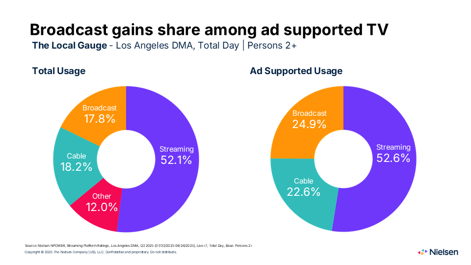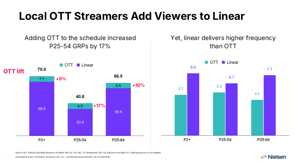 I asked to see some examples of the data, and Nielsen provided these views, anonymizing the parties involved. The first slide below is November 2025 data for a specific brand campaign that ran on three broadcast stations in Los Angeles. Looking at that campaign, we can see that by including the streaming part of those stations’ audience, reach of adults 25-54 was increased by +19%. It’s easy to see why any station would want the streaming part of their audience counted in the local currency.