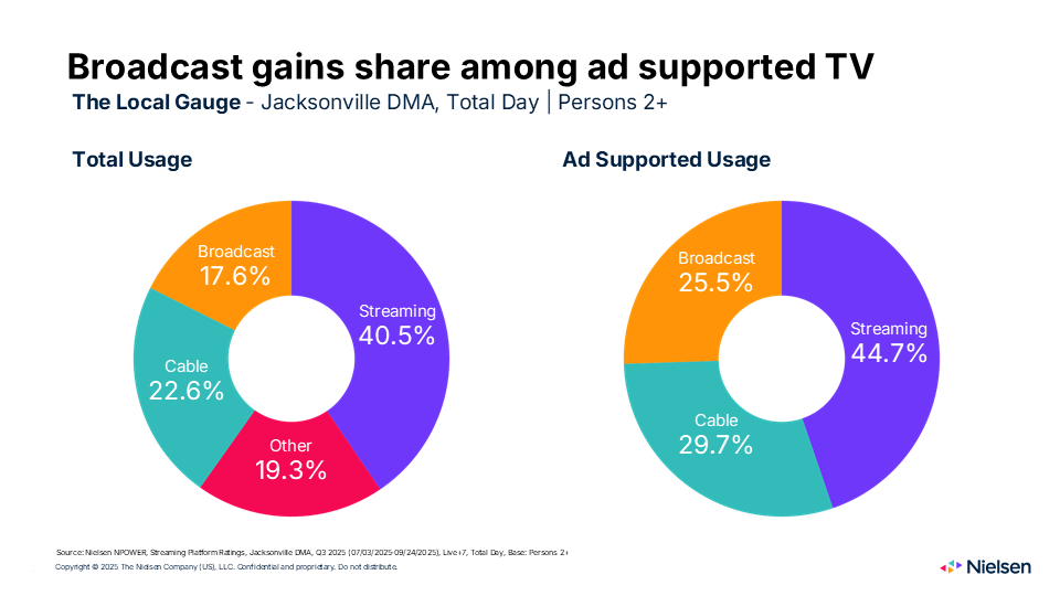 Stations are also buying local Gauge reports to understand how their market is transitioning to streaming vs. the national Gauge. Here’s a look at how a few of those markets look in terms of the shares of audience of linear broadcast, linear cable, and streaming.