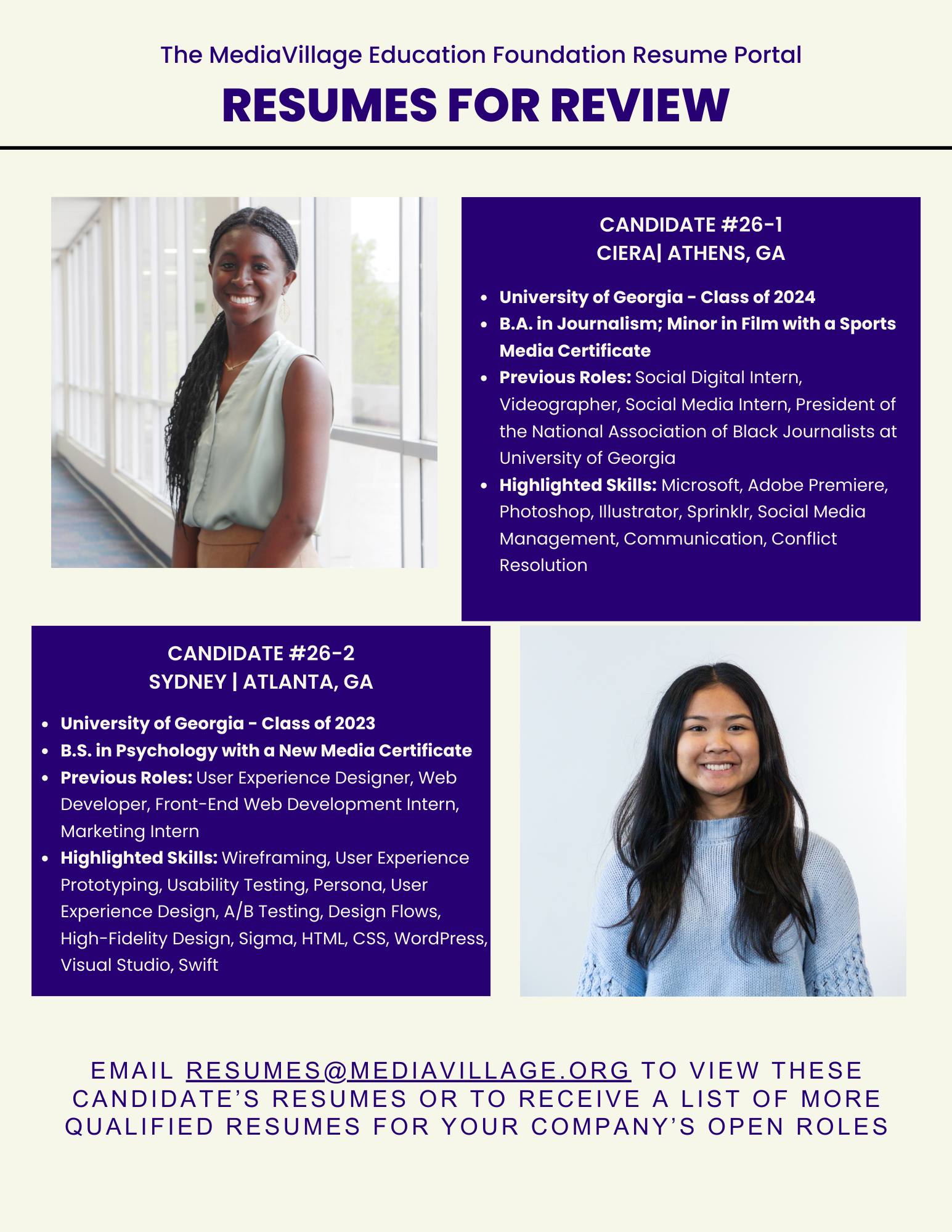 E-mail resumes@mediavillage.org to be connected with candidates. Resumes are listed with permission.