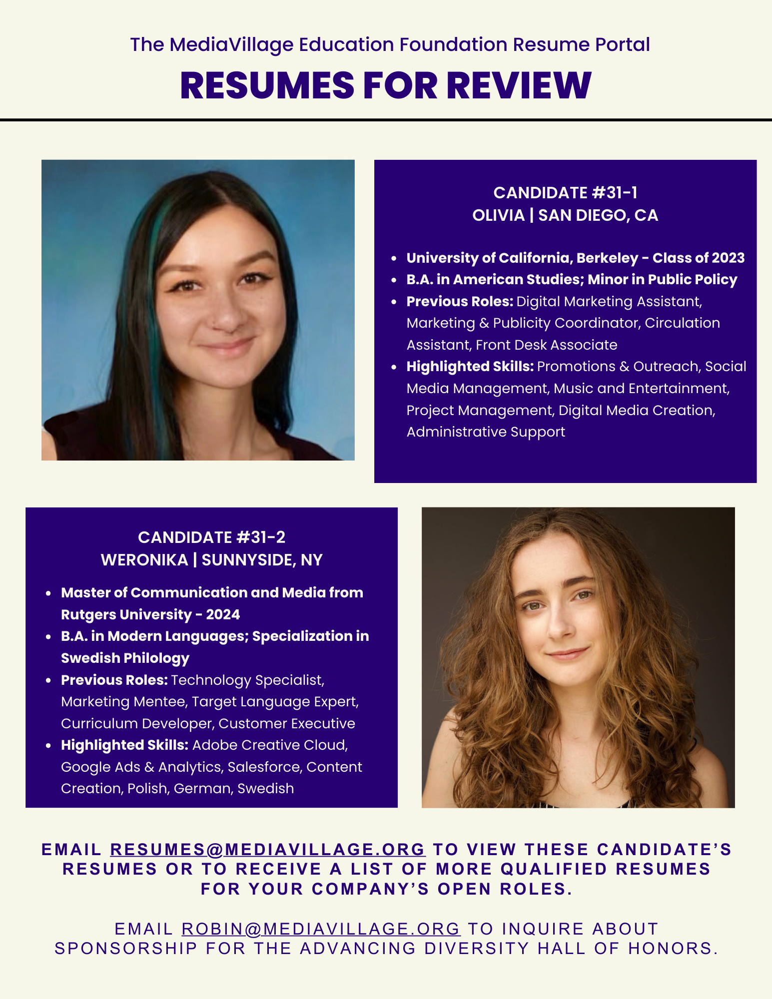 E-mail resumes@mediavillage.org to be connected with candidates. Resumes are listed with permission.