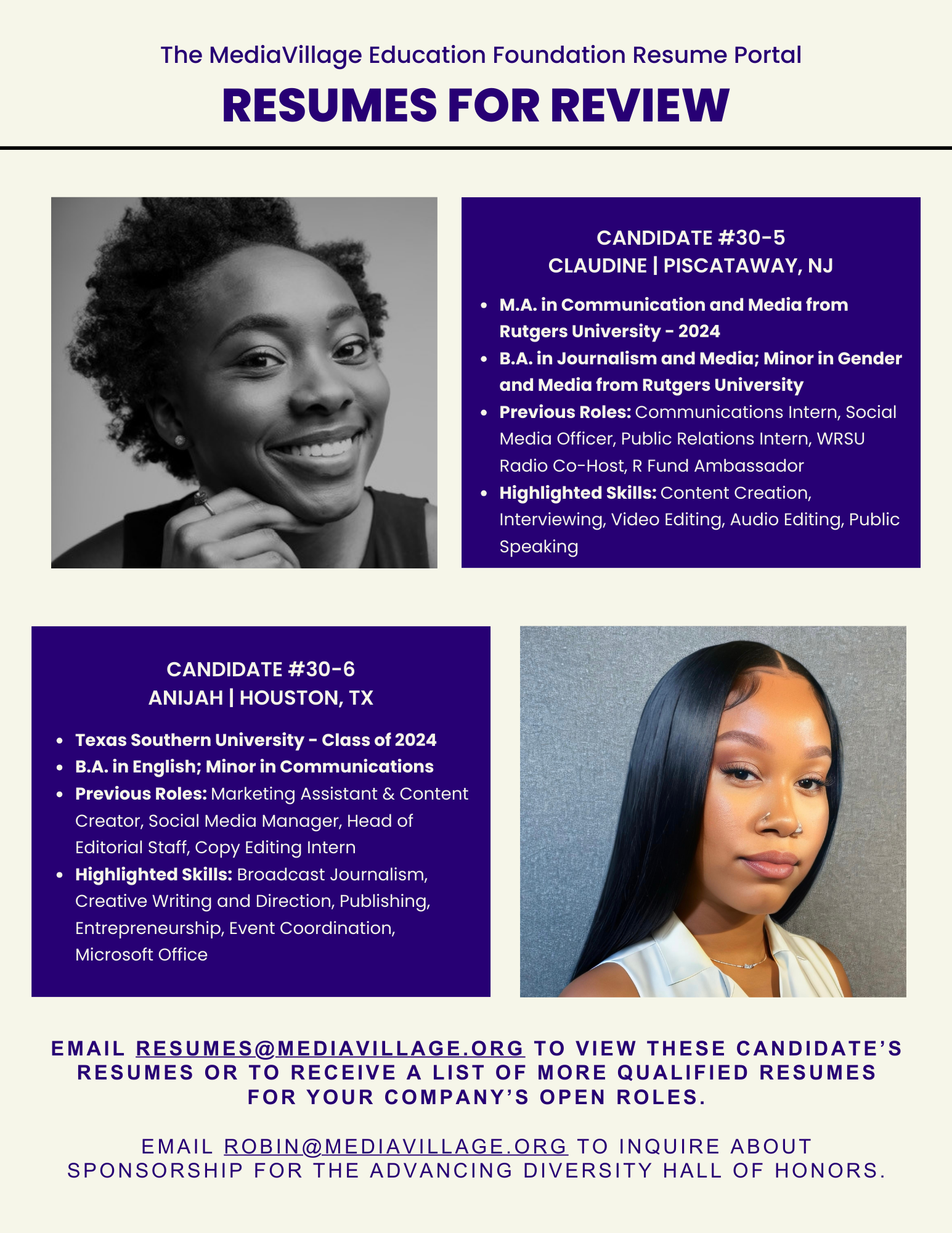 The MediaVillage Education Foundation coordinates with college career centers and organizations to attract diverse talent to our community. Each week in this space we are highlighting profiles of candidates who have submitted resumes at our AdvancingDiversity.org Resume Portal, where anyone looking to join the media and advertising business is encouraged to submit their CV and be connected to hiring teams. Watch for this weekly Resumes for Review e-mail.