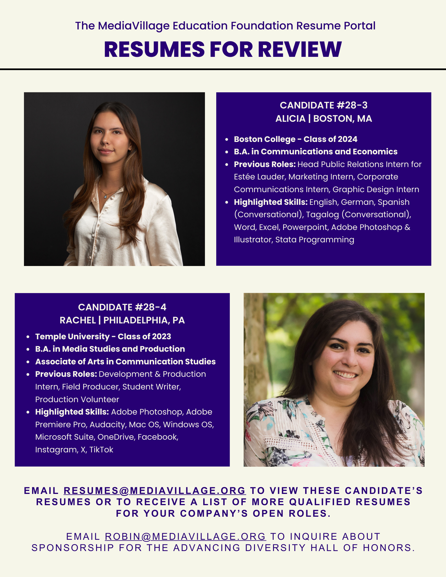 E-mail resumes@mediavillage.org to be connected with candidates. Resumes are listed with permission.