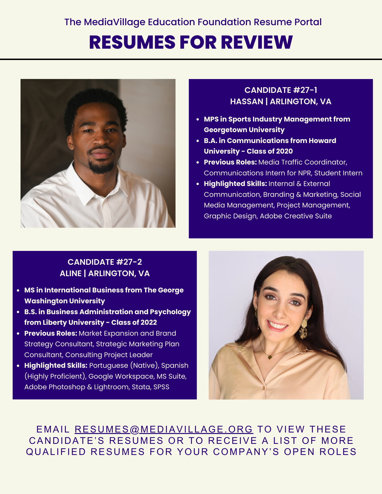 E-mail resumes@mediavillage.org to be connected with candidates. Resumes are listed with permission.