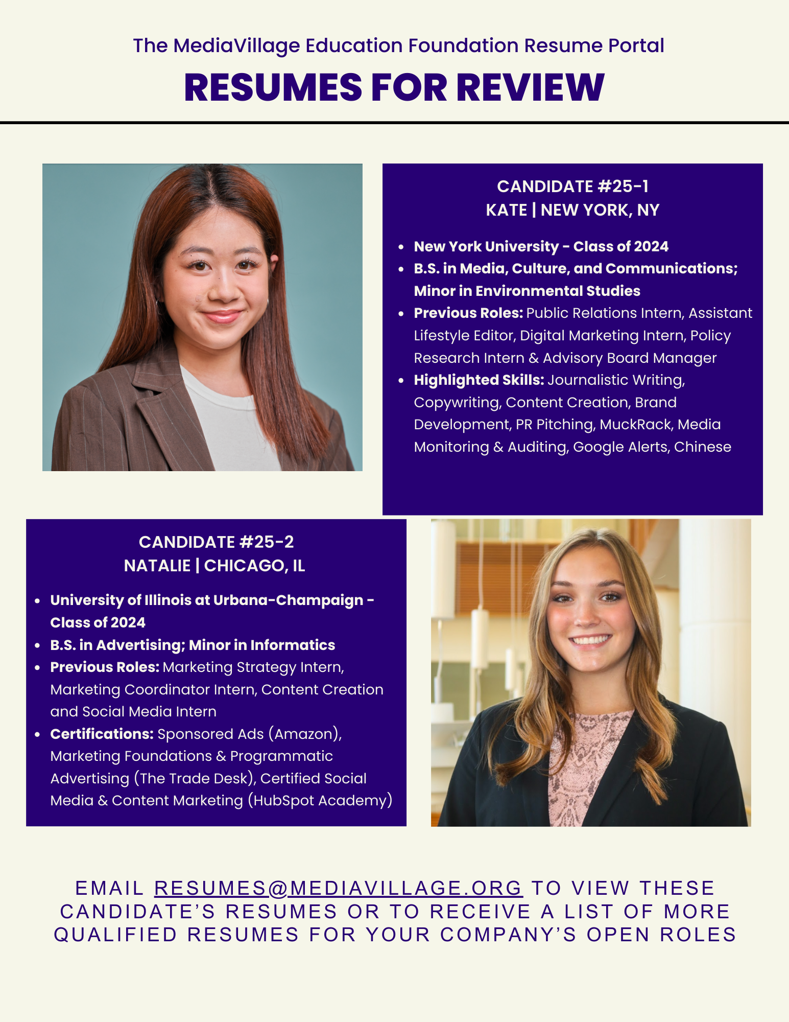 E-mail resumes@mediavillage.org to be connected with candidates. Resumes are listed with permission.