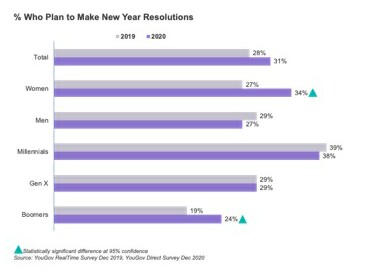 As we transition from 2020 to 2021, we're seeing slightly more Americans planning to make New Year's resolutions. This is driven by significant increases in resolution-making among Women and Boomers. (Since we see no real change among men or younger generations, presumably Boomer Women are the largest group adopting resolutions at a higher rate this year -- something to note if they're your target audience!)