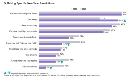 As marketers think about what consumers want for themselves in 2021, I suppose we shouldn't be surprised that amidst a global pandemic, the basics of health and wellness loom largest on consumers' minds. Being largely home-bound for the better part of the past year had reduced our activity levels and changed our eating habits, and brands who can deliver on exercise and weight loss have an opportunity to lean into new year's resolutions and help consumers accomplish their exercise and weight loss goals.