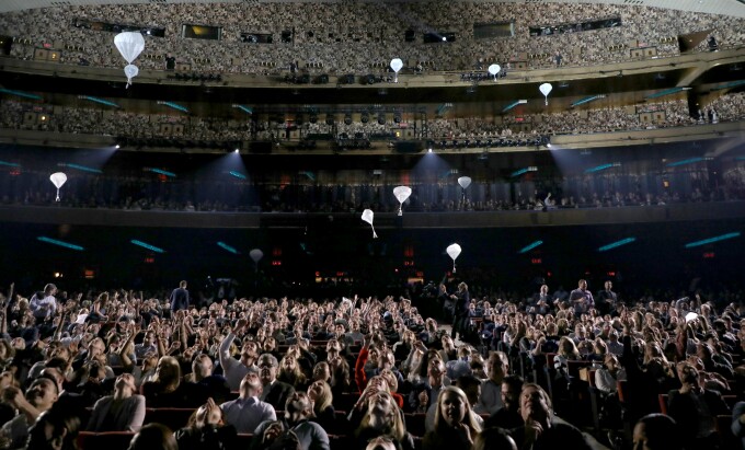Star Turn: A musical lineup to behold, with knockout performances from Dua Lupa, Lele Pons and Daddy Yankee, complete with backup dancers and lighting effects that at times converted the Radio City Music Hall ceiling into the Hayden Planetarium. During one second-act sequence, balloons and cookies rained down on the audience (photo below). That’s right – rained! Comedian/actress Tiffany Haddish had the crowd in constant belly laughs, telling us how YouTube impacted her life. “I’m a mechanic now,” Haddish said. “I’m a reiki healer now. I can also make Red Button shoes, but you can’t walk that far because they turn into brown bottoms.”