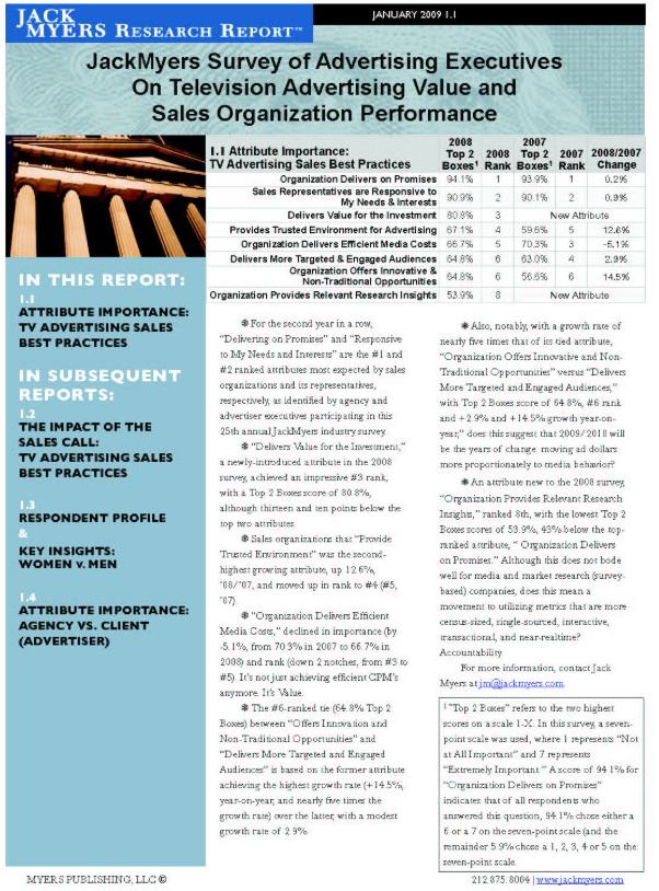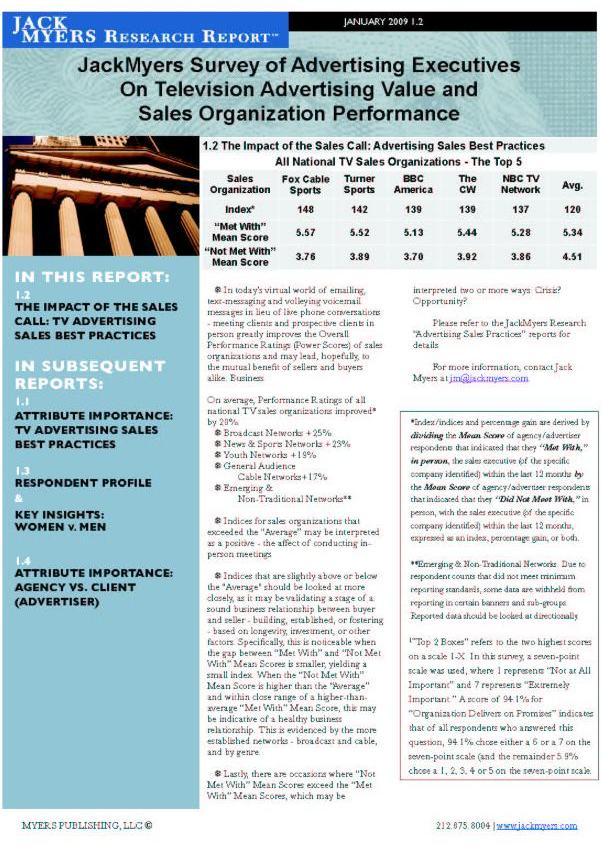 Nickelodeon Kids and Family Group has been named Best TV Sales Organization of 2008 by more than 250 advertiser and agency executives who participated in this year's Myers Survey of Advertising Executives on National TV Value and Sales Organization Performance.This is the 25th year the Myers survey has been conducted and the first time Nickelodeon has been the top performer. A total of 38 national TV sales groups were included in the vote, which measures each organization on seven performance attributes. Of the seven attributes, Nickelodeon ranked first in three categories and second in two categories. The top five national TV sales organizations, which includes broadcast and cable networks, also included Scripps Networks, The Weather Channel, NBC Universal Cable Networks and Hallmark Channel. Several sales organizations, Such as A&E Networks, Turner Entertainment and Fox Broadcasting were named by ad execs as the most outstanding organization for delivering on promises. The top five network organizations in each of the seven attribute categories are listed in the attached documents, along with additional insights from the Myers survey. The full reports are available exclusively to subscribers to Jack Myers Media Business Reports, which includes a weekly proprietary report on the media business, all Myers research studies conducted throughout the year, Myers' exclusive media and advertising industry economic forecasts and special White papers issued regularly by Myers Publishing. For more information, visit www.myersreport.com or e-mail jm@jackmyers.com