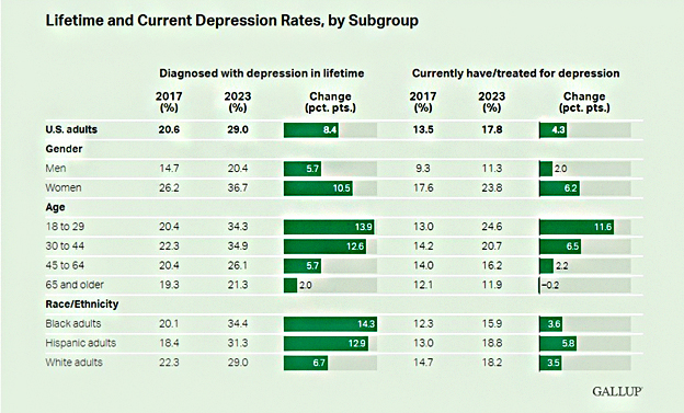However, other things change faster, such as the habits and mental/emotional states of consumers. Numerous sources have reported that there is a rising crisis of despair, depression, and suicide among 18-34 Americans. For example, Gallup in May 2023 reported that in 2017, 18-29-year-olds in the U.S. were about average in terms of being diagnosed with depression, but by 2023 that level had increased +68% in just six years, to over one in three people in that age group.