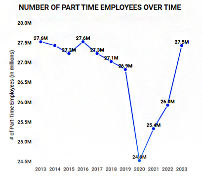 It appears that with these shifts there has been some reduction in overall media usage among 18-34. The absolute number of hours and minutes per week across the media data above from Nielsen (video and social media) and Edison (audio) come up lower in 2023 than in 2017. Where is this time going? Some of it, among the most depressed, might simply be laying around. Some of it might be more positive use of time, such as working, studying, or pursuing lofty ambitions. There has been a great increase in part time employment during this same time period (except during Covid):