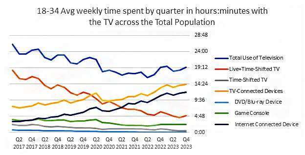 The same age group has also shown the greatest shift in media habits over the same period. Based on Nielsen, between 2017 and today, 18-34 has shifted strongly from watching live and time-shifted linear television, to streaming video. Over 60% of the time spent with TV now is via streaming for 18-34, as compared with 36% for the total population. Even videogame usage went down during this period among 18-34 as the use of streaming rose among this group, both on TV-connected Devices (smart TVs and USB adaptors) and on Internet-connected devices (computers, tablets, and especially smartphones).