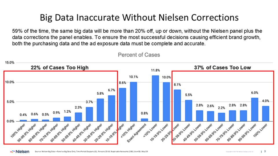 In the footnote of the first graph above and in the text, I’ve referred to Nielsen corrections made to BD. These are pretty important. BD pretty much leaves out streaming. Smart TVs give great data, but typically for only one set in the household, and for less than a quarter of all program content (but which represents about three quarters of all viewing minutes). There are other types of errors, and Nielsen has correction formulae for all of them. This next chart shows how far off the raw BD would be without those corrections. 59% of the time, the data would be off more than 20%.