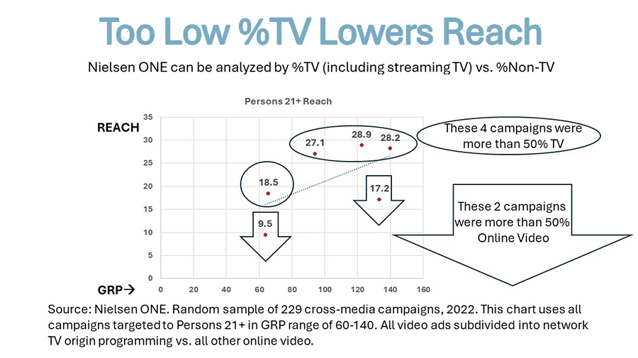 What this reminds us is that in the small end of things, linear plus NTD is vitally important in maximizing reach. It’s only when reach has gone over around 50% that the best optimizers begin to gradually switch to a mix of TV+NTD with OLV (including influencers), radio, display, print, outdoor, experiential, cinema, and other media/marketing types.