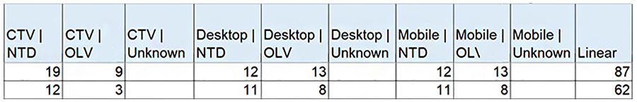 Nielsen ONE Ads contains over 45,000 campaigns, a number that is growing every month. For this study, I selected a random sample of 229 campaigns. As I began to look through the fascinating Nielsen ONE Ads data, what popped out first was that I noticed a small percentage of campaigns consist of 85% or more of OLV. The highest reach attained is 17.2% with 133 GRPs against the target. More typically across these 130-140 GRP campaigns which generally use quite a bit more NTD than OLV, 133 GRPs would get you ~23.8% reach. So, no surprise, counting on a single form of video for your advertising is not the way to go in the 21st Century.