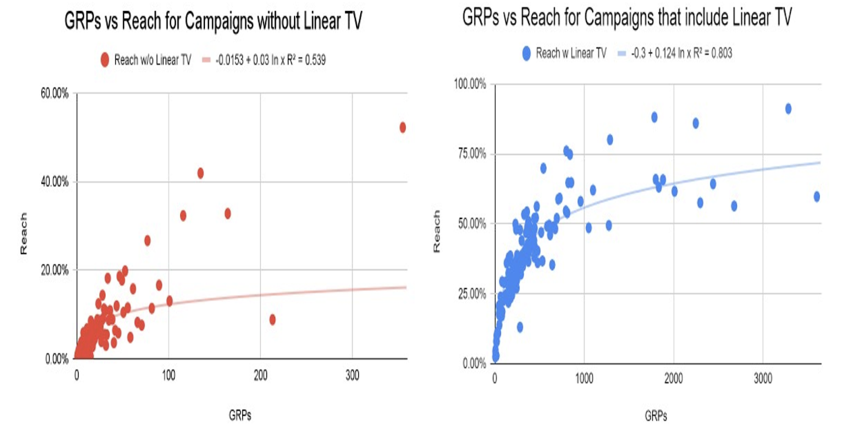 One might wonder what that outlier is on the digital-only campaigns graph at upper right which achieves over 50% reach despite not having any linear attached to it yet. And does so using only 350 GRPs! Those used to planning and buying digital know that it’s difficult to achieve reach that high without linear. (We thought TV was fragmented -- digital is atomized -– making it even harder to gain reach.)