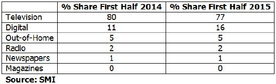 What is the shifting media mix for theatrical motion pictures? Although there were some striking shifts from first half 2104 to first half 2015, 77% of the money is still in television, down from 80% in 2014. Under this seemingly steady surface, the small magazine spend increased +70% while newspapers declined -67%, digital grew +22%, out-of-home declined -19% and radio shrank -13%. In fact the total motion picture category cut back spending -13% across all media types combined.