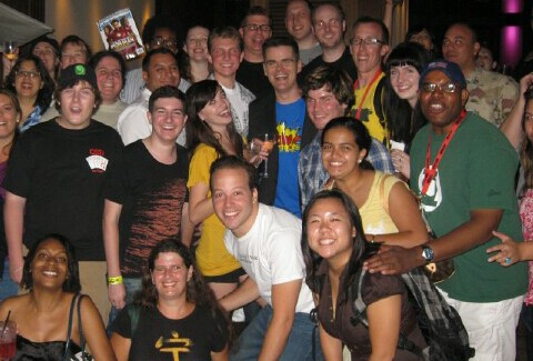 Earlier that night I attended a small cocktail party thrown by Entertainment Weekly (also at the Hard Rock) intended as a meet and greet between EW staffers and the “digital elite.” The highlight of that event was the arrival of approximately 100 fans of my pal Michael Ausiello, the EW television writer and blogger known as much for his spoilers as his snark. These Ausholes (as Ausiello’s fans are known) were the winners of a contest for Ausiello readers who were attending the Con. (Ausiello is the fellow with the black jacket and blue T-shirt in the photo below.)