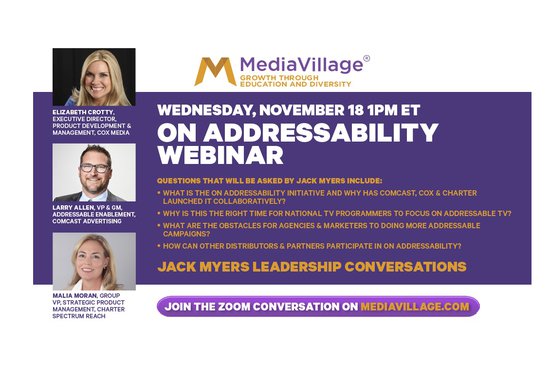 To educate and prepare brand marketers, agency media professionals and TV executives as Addressable TV scales across the marketing ecosystem, three leading industry experts will take a "Deep Dive – On Addressability" in a 60-minute webinar hosted by MediaVillage founder Jack Myers on Wednesday, November 18 at 1PM ET. The webinar is complimentary and available for ZOOM pre-registration here or live streamed at www.MediaVillage.com, www.ComcastInsites.com, www.spectrumreachinsites.com and via MediaVillage social channels at Facebook, Twitter and LinkedIn.