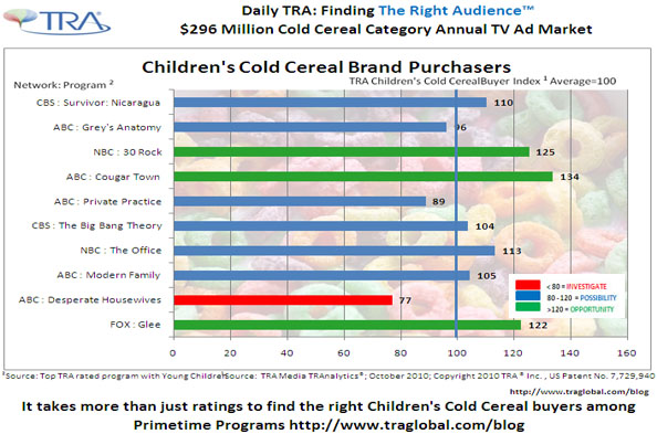 TRA’s purchaser target ratings provide a perspective on which programs are being watched by the buyers of children’s cold cereals, whether live or time-shifted. Among the top-rated primetime programs in households with children aged 4-12, some programs were good vehicles for reaching children’s cold cereal buyers, while others weren’t. For example, ABC’s Cougar Town and NBC’s 30 Rock and Fox’s Glee are good choices for Cinnamon Toast Crunch, Frosted Mini Wheats, or Fruity Pebbles to advertise to parents as they offer both a high rating among households with young children and a high concentration of Children’s Cold Cereal buyers. By using the TRA purchaser target ratings, advertisers can reach The Right Audience™, and “bring out the tiger” in their media buy, thereby getting it to stay crunchy in milk.
